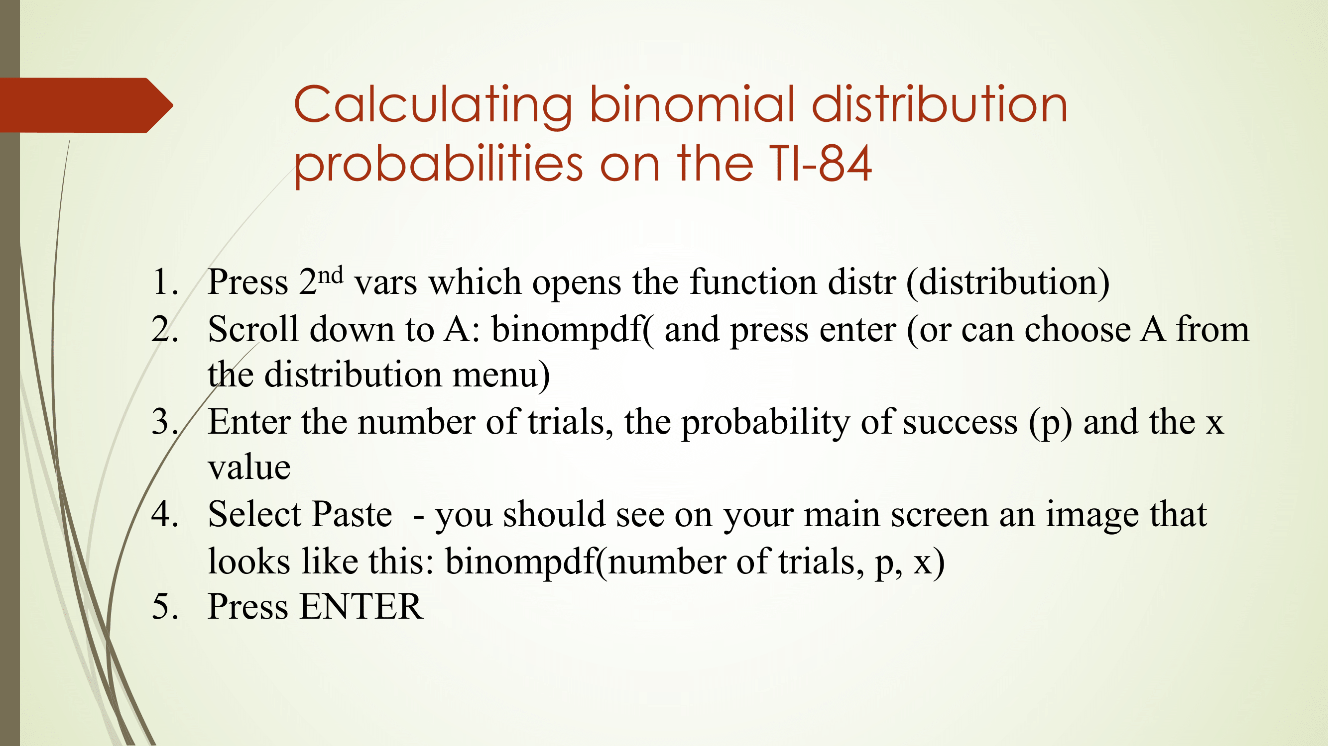 You can find the slides for this class here (themed version) or here (printer version).Here are the instructions on how to find binomial probabilities on the TI-84: