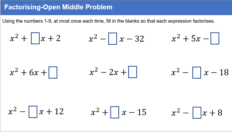 | 15 | Thursday, March 13 | Factoring Trinomials & Special Factor Patterns (5.5-5.6) Shared Factors Puzzle Factoring Puzzle Area Puzzle Open Middle Puzzle Homework 11 |